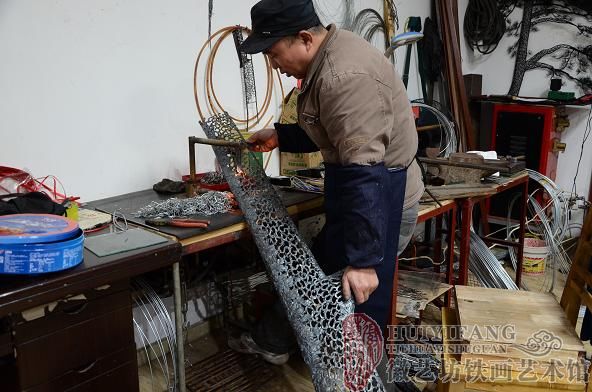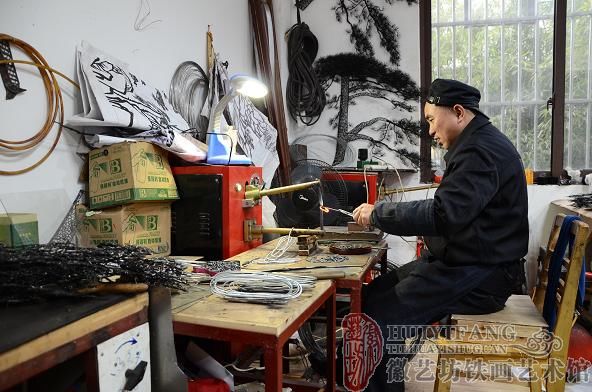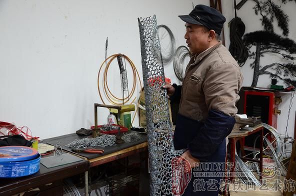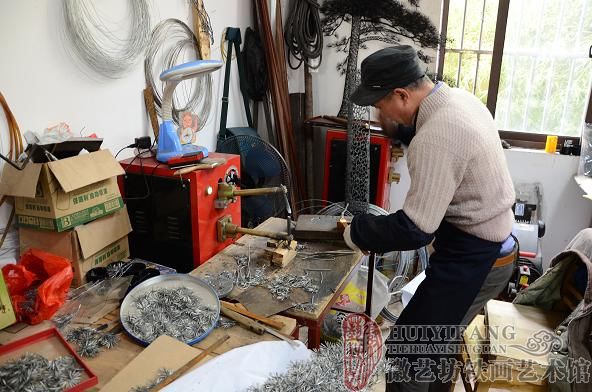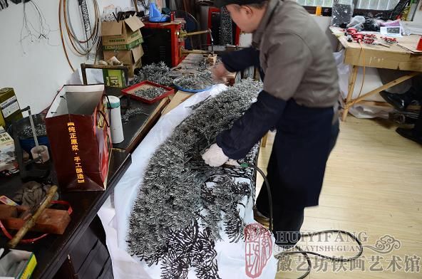 魏民春鐵畫大師正在打制大型迎客松(制作迎客松樹頭部分小配件)
