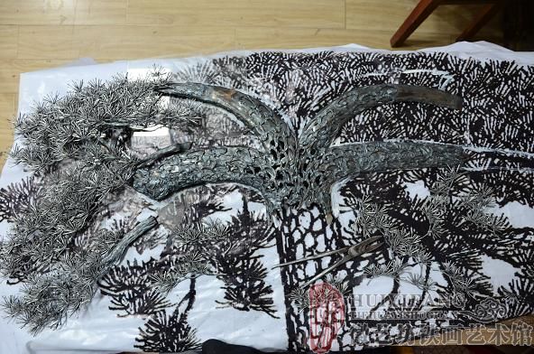 魏民春鐵畫大師正在打制大型迎客松(樹皮配件)
