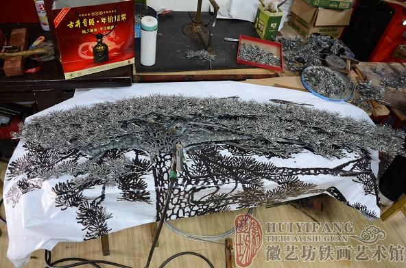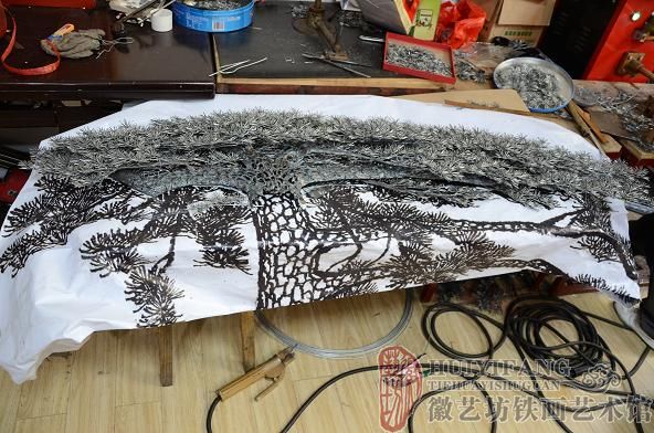 魏民春鐵畫大師正在打制大型迎客松(展示已打好的迎客松樹干)