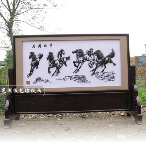 內(nèi)容導(dǎo)讀:《高檔八駿圖屏風(fēng)-馬到成功》,畫(huà)面中鋼鐵駿馬神猛長(zhǎng)嘯,高驤縱姿,給人以一往無(wú)前的精神力量,馬為鐵畫(huà)的傳統(tǒng)題材之一,是勇猛的化身,作者的高超的鍛技錘打出豐滿(mǎn)健壯的馬體和剛勁的鐵蹄,畫(huà)中雙馬黑白分明,蹄飛鬃舞,高驤縱姿,齊頭并進(jìn),氣勢(shì)橫空,栩栩如生,給人以?shī)^勇拼搏,一往無(wú)前的精神力量。是做所為商務(wù)禮品、辦公室裝飾畫(huà)、書(shū)房裝飾畫(huà)的最佳選擇。