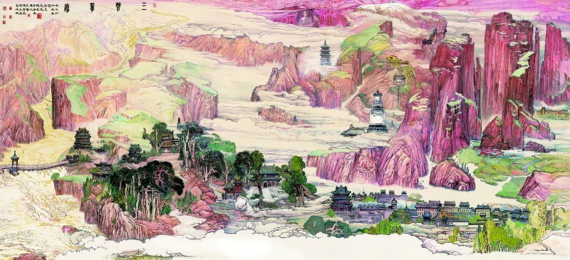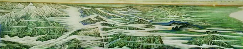 畫作長16米,寬3米,是迄今為止人民大會堂內(nèi)最大的一幅國畫作品。它也是央視出鏡率最高的一幅山水畫作品,十幾年來,幾乎每晚都會出現(xiàn)在中央電視臺《新聞聯(lián)播》中。