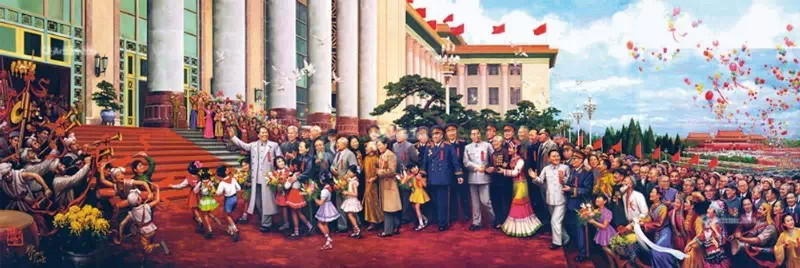 按要求,《江山如此多嬌》的畫心高5.65米,寬9米;裱糊好后,畫高6.57米,寬10.08米。由于畫幅太長,拉畫的汽車裝不下,當(dāng)時只好找了10多個人扛著走到大會堂去。由于畫幅高大,粘貼時需搭三層架子,光是刷糨子就用了5個人。經(jīng)過一番苦戰(zhàn),最終圓滿完成裝裱。