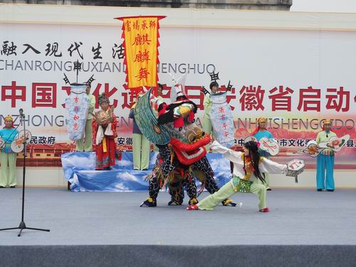 流傳在歙北富堨鎮承獅村的麒麟舞,傳說始自清乾隆年間,距今約有250年歷史。承獅麒麟舞有角色人物及念白、唱(昆)腔,有戲劇情節,內容豐富,形成獨特的藝術風格。承獅麒麟舞,1958年參加歙縣、蕪湖市、安徽省三級文藝匯演,獲得安徽省民間舞蹈二等獎�,F今,在市、縣文化部門,富堨鎮政府,承獅村民的共同努力下,承獅麒麟舞又重新得以恢復,并在2016年全國文化遺產日安徽省啟動儀式暨主場活動中,首次亮相參加演出,獲得好評。